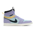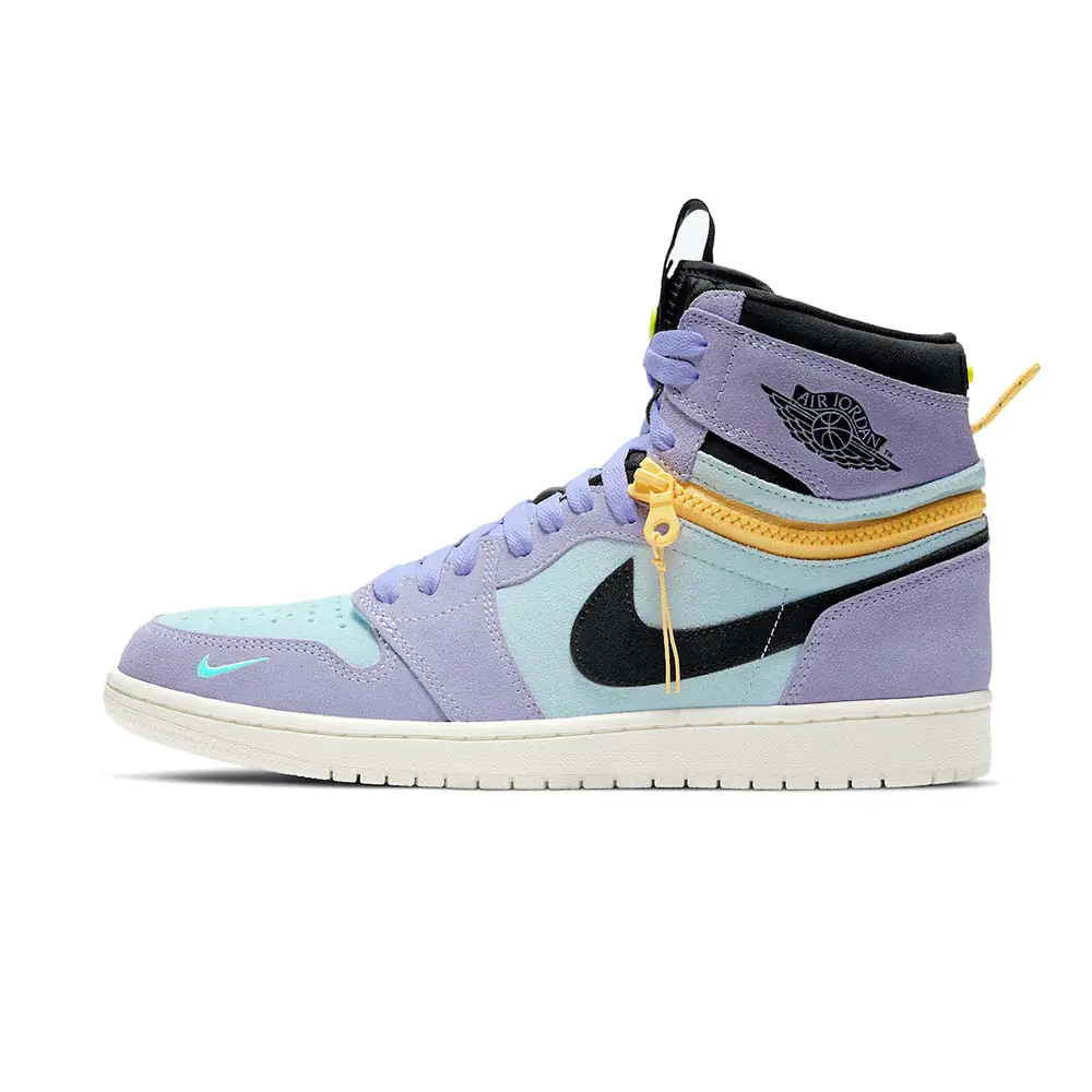 The Air Jordan 1 High Switch is Jordan Brand’s newest rendition of Michael Jordan’s first signature shoe that will be making its debut throughout 2021.One of the pairs that will be available comes dressed in a Purple Pulse, Glacier Blue, Sail, and Black color scheme. This Air Jordan 1 features a zippered ankle collar that allows you to wear the pair as a high or low. The shoe comes in full suede featuring a Glacier Blue upper with Purple Pulse overlays. Black covers the ankle area, tongues, Wings and Swoosh logos with a Yellow zipper and heel pull tab. Blue also appears on the mini embroidered Swoosh on the toe completed with a Sail rubber outsole.