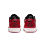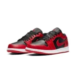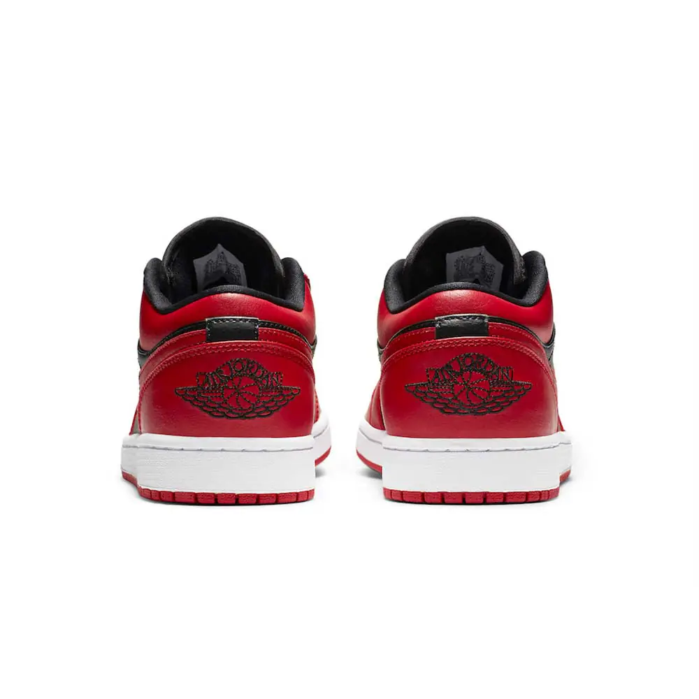 This offering of the Air Jordan 1 Low features a Black leather upper with Varsity Red leather overlays and Black nylon tongues. A Red Jumpman on the tongue, Black Wings logo on the heel atop a White midsole and Red rubber outsole completes the design.