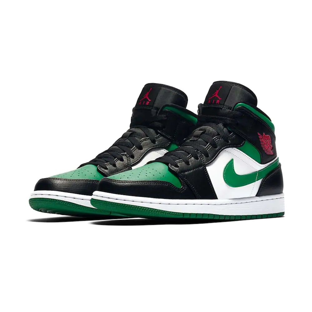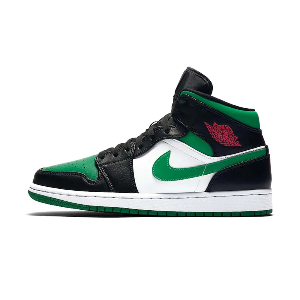 The Air Jordan 1 Mid “Green Toe” is part of Jordan Brand’s continuous efforts of creating ultra-wearable colorways of Michael Jordan’s first signature shoe in mid-top form. Premium leather highlights the upper as black leather overlays on the forefoot and eyelets is contrasted by a white leather base. Jordan Brand references classic Air Jordan 1 styling by equipping the shoe with a perforated green leather toe that contrasts the forefoot. Vibrant red Wings branding on the black collar finishes off the styling.
