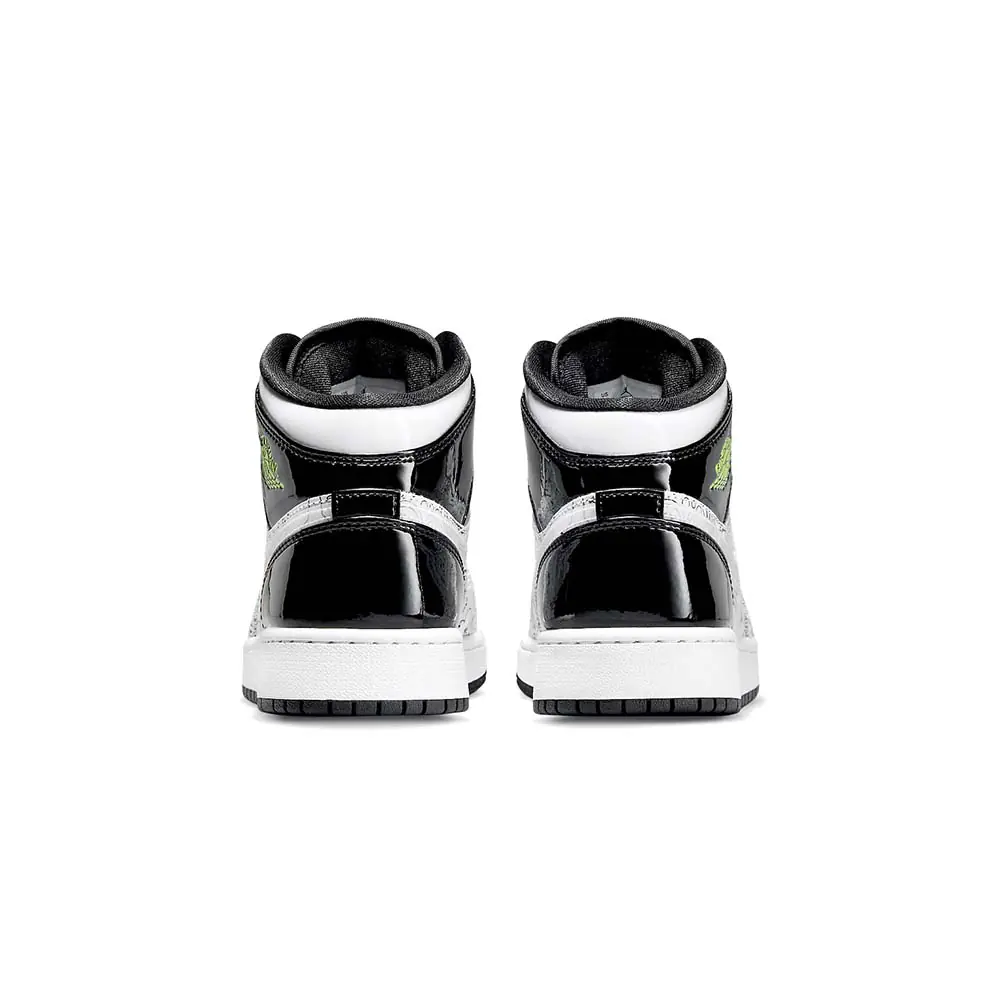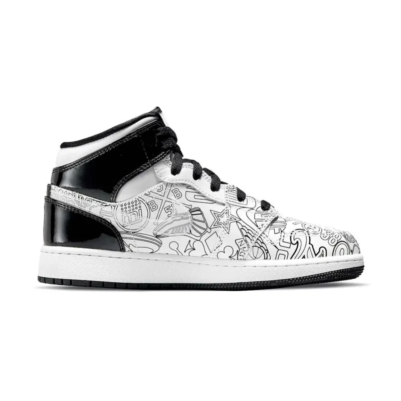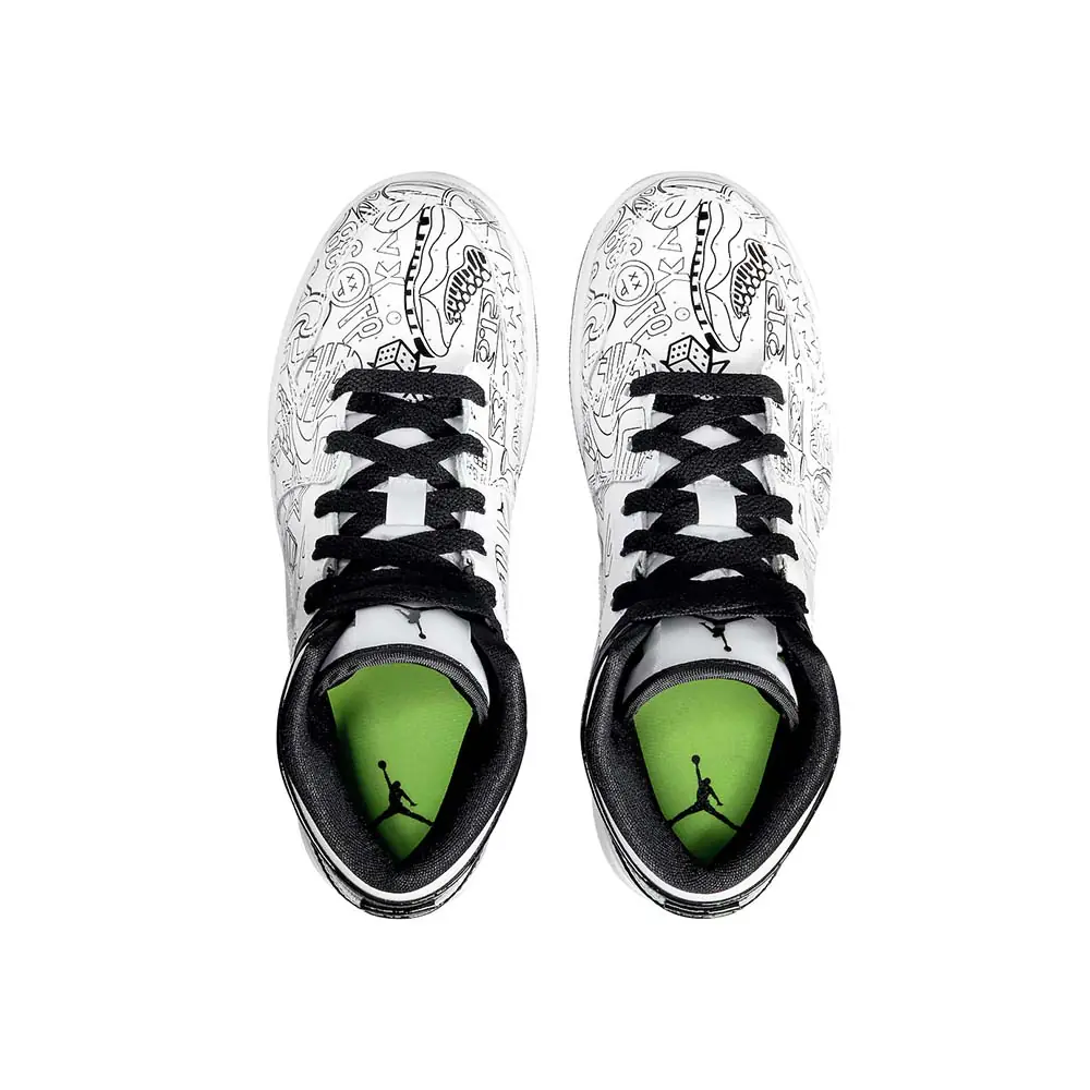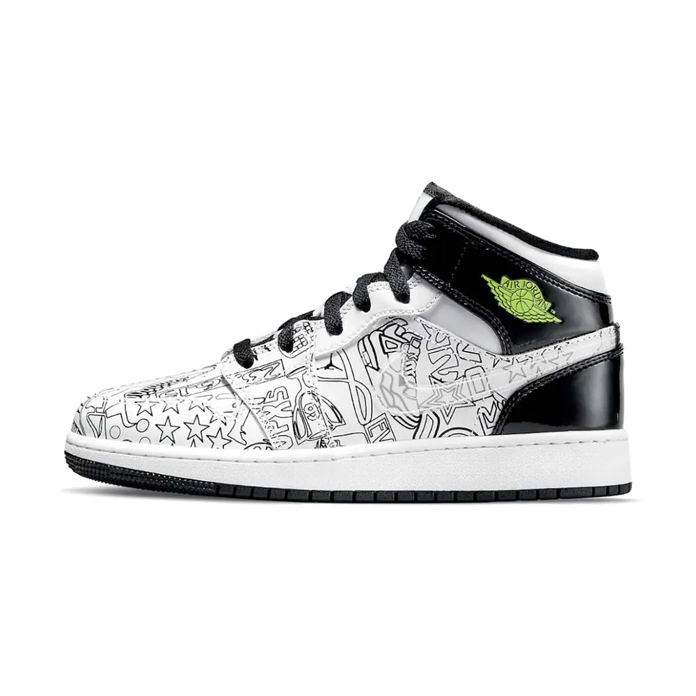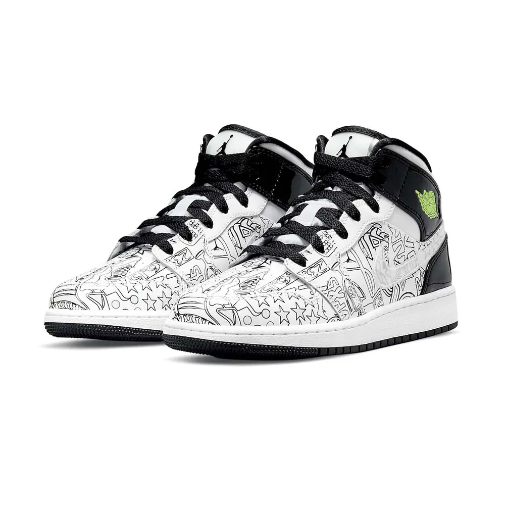 Jordan Brand will be releasing a new Air Jordan 1 Mid “DIY” colorway that will be available exclusively in kids sizing.Dressed in a White, Black, and Volt color scheme. This Air Jordan 1 Mid encourages kids to create their own colorful design. The shoe features blank outlines of memorable logos, silhouettes and more with clear Swooshes on the sides, Volt Wings logo and insoles along with Black patent leather overlays in the rear. Jet Black laces, Jumpman logos, lining, and rubber outsole completes the design.
