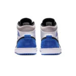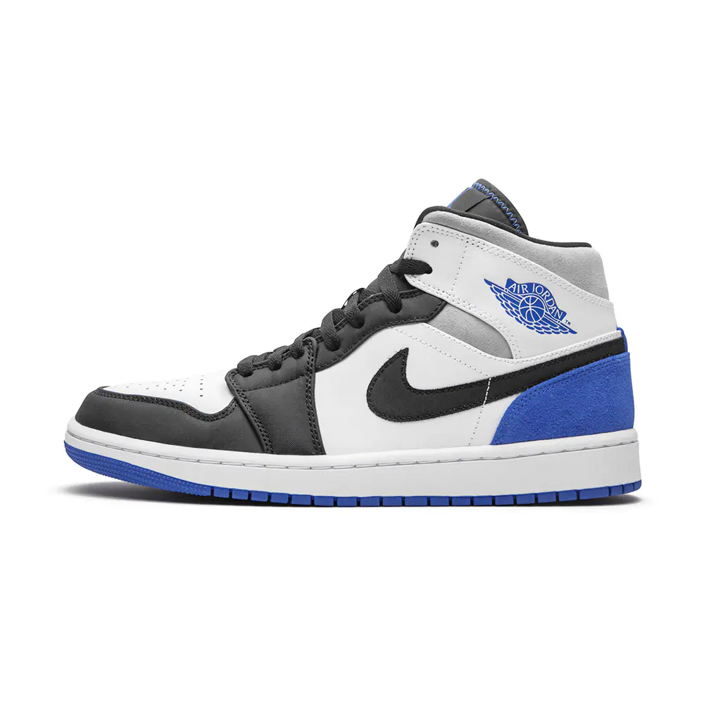 The Air Jordan 1 Mid “Game Royal Black Toe” combines two of the most recognizable colorways of Michael Jordan’s first signature shoe in the popular mid-top silhouette. The “Bred Toe” Jordan 1, which was an original colorway of the shoe from 1985, inspires the color block of the white perforated leather toe and black leather overlays on the forefoot. Branding appears in the form of a black leather Swoosh on the mid-panel and Game Royal “Wings” detailing on the white leather collar. Grey suede is located on the collar and royal blue suede dots the heel. A black nylon tongue with blue “Nike Air” branding on the black leather tongue tab completes the look of yet another stately Jordan 1 Mid. Release date: Summer 2020.