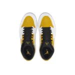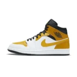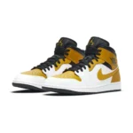 The Air Jordan 1 Mid “University Gold” is a summer-ready colorway of the amid-top version of Michael Jordan’s first signature shoe. Appearing on the popular mid silhouette of the Jordan 1, the “University Gold” features warm University Gold leather detailing on the perforated toe, eyelets, mid-panel, collar, and heel. The same golden hue of leather appears on the Swoosh branding on both sides of the shoe and on the Jumpman insignia on the black nylon tongue tag. A black “Wings” logo can be found on the collar. A crisp cut of white tumbled leather appears on the forefoot, toe cap, and mid-panel. The white midsole is contrasted by a black outsole to round out the look of the Air Jordan 1 Mid “University Gold.”