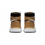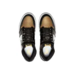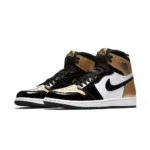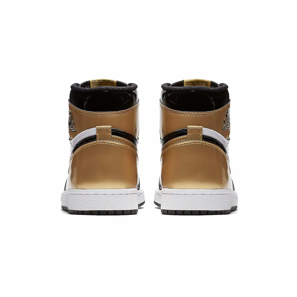 The Air Jordan 1 Retro High Og NRG ‘Gold Toe’ features a black patent leather upper with distinctive metallic gold accents on the perforated toe box, tongue branding, and the heel panel. The high top also boasts a white side panel which extends from the midfoot to the heel, and a white rubber midsole. Other details include suede accents on the lacing structure, large Swoosh branding, and a tonal black outsole.