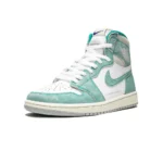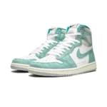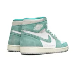 The Air Jordan 1 High “Turbo Green” is a unique colorway for the classic Michael Jordan signature shoe that released as part of the 2019 NBA All-Star collection from Nike and Jordan Brand. The washed leather upper in Turbo Green and white pays tribute to the classic Charlotte Hornets team colors, the host team for the 2019 All-Star game, and gives the shoe a vintage look. A gold and purple Nike logo are found on the tongue, and alternate purple laces are included to add to the Hornets vibe. The upper also features a new detail that appeared on select pairs of Air Jordan 1’s in 2019: text of the model name and season of release printed on the midfoot.