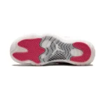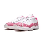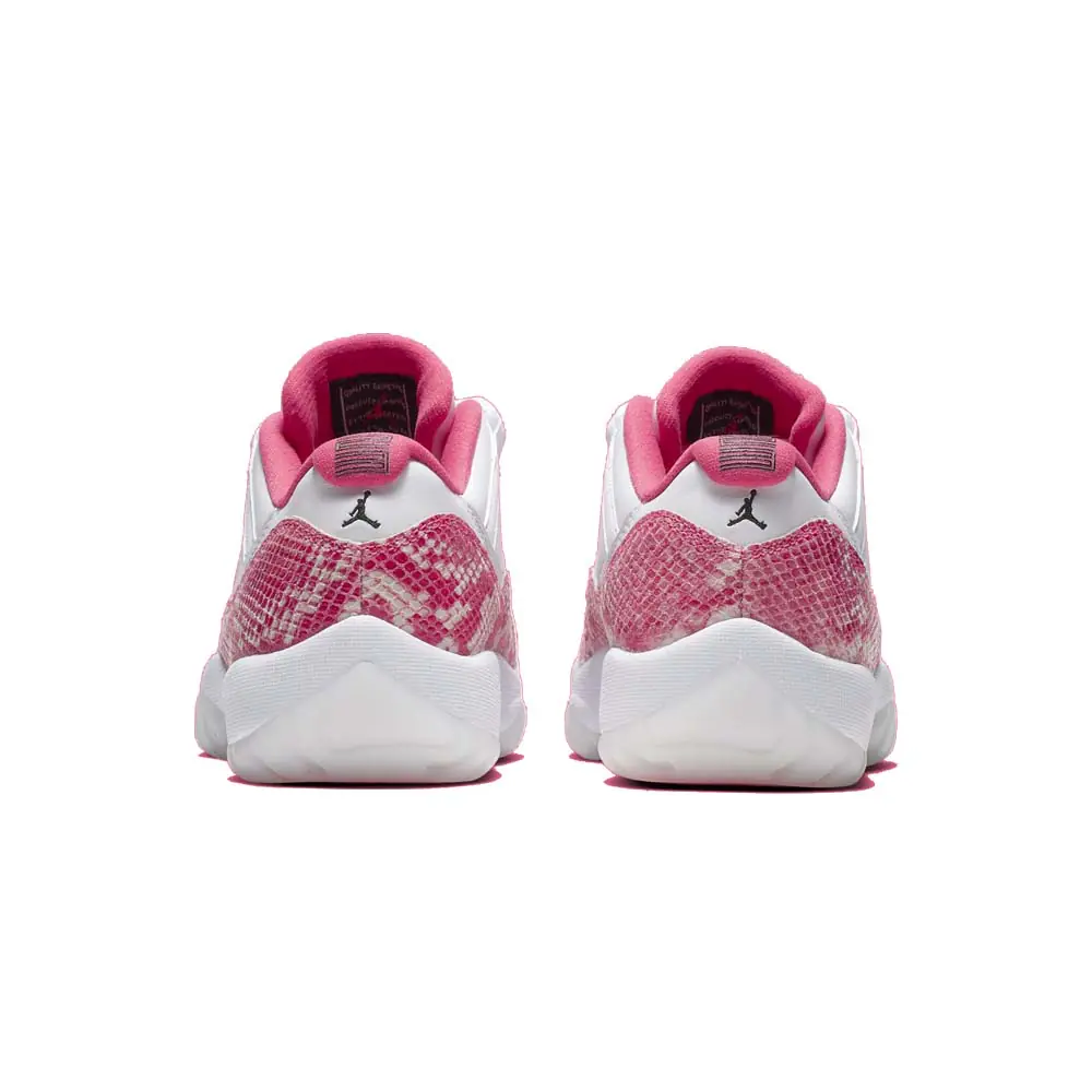 An original colorway of the Air Jordan 11 Low back in 2001, this low-cut style is revived with the ladies’-exclusive Wmns Air Jordan 11 Retro Low ‘Pink Snakeskin’ sneaker. Released in May 2019, its smooth white leather upper is decorated with glossy snakeskin mudguards. Below, the shoe rides along a foam midsole and translucent outsole.