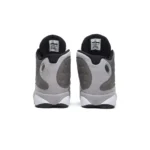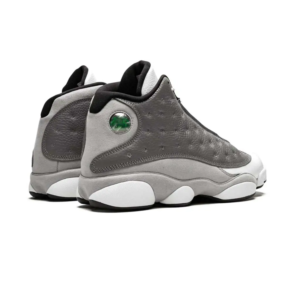 The Air Jordan 13 Atmosphere Grey is one of the most versatile colorways of Michael Jordans legendary thirteenth signature shoe. The Jordan 13, which has been heralded for both its innovative performance aspects and stately appearance, was worn by Jordan during his last complete season with the Chicago Bulls in 1997-98. The upper features a dark grey dotted leather build that is contrasted by a light grey suede mudguard and midsole. A panthers eye holographic emblem dots the heel. Both the toe and perforated tongue are finished off in crisp white leather. Notable branding includes a black nylon Jordan tab on the toe and a black embroidered Jumpman on the tongue. The Air Jordan 13 Atmosphere Grey was released on March 23, 2019.
