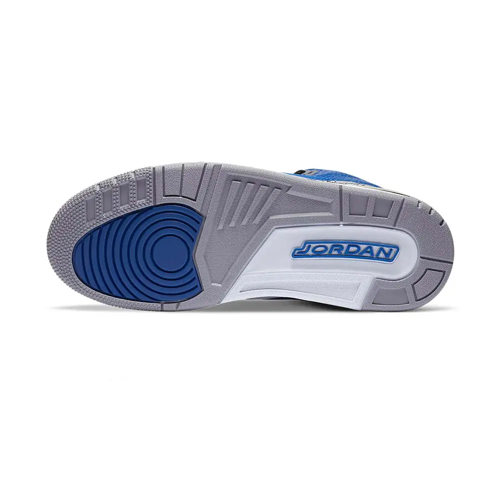 The Air Jordan 3 “Varsity Royal” is a desirable non-original colorway of Michael Jordan’s third signature shoe that was released in Fall 2020. Dressed in a color scheme reminiscent of the “Red Cement” Jordan 3 that debuted to much fanfare during the NBA’s All-Star Weekend in 2020, the “Varsity Royal” plays up on the silhouette’s throwback styling while remaining fresh in every aspect of its design. Appearing in the same color block of the “Black/Cement” colorway, the upper swaps black tumbled leather with Varsity Royal leather. The iconic elephant print panels are found on the toe and heel. White Jumpman detailing appears on the heel and an Air window in the heel of the midsole helps retain the original look of the Jordan 3. Release date: Fall 2020.