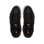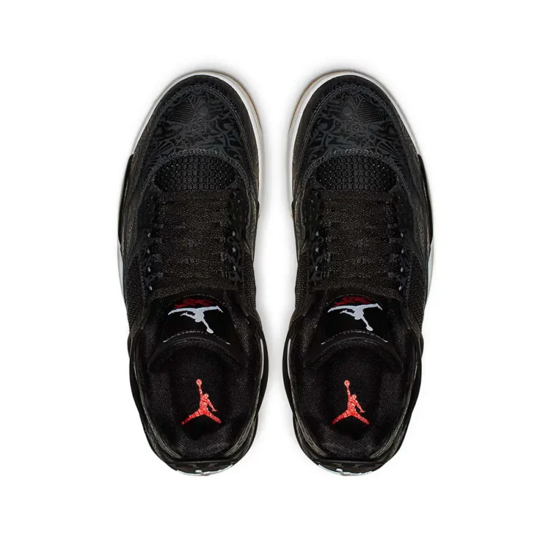 The Air Jordan 4 Black Laser is a special edition of the iconic Michael Jordan signature shoe featuring a classic laser graphic by Jordan Brand. Originally appearing on the Air Jordan 20 and an older release of the Air Jordan 4, the Laser pattern features an intricate mix of graphics inspired by Jordans career and the history of Jordan Brand. It appears on this 2019 release as a glossy tonal print on the black leather upper. The all-black upper is complemented with a white midsole and gum rubber outsole. Hits of red appear on the Flight text on the tongue as well as the Jumpman on the outsole and insole. The Air Jordan 4 Black Laser released on January 19, 2019.