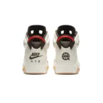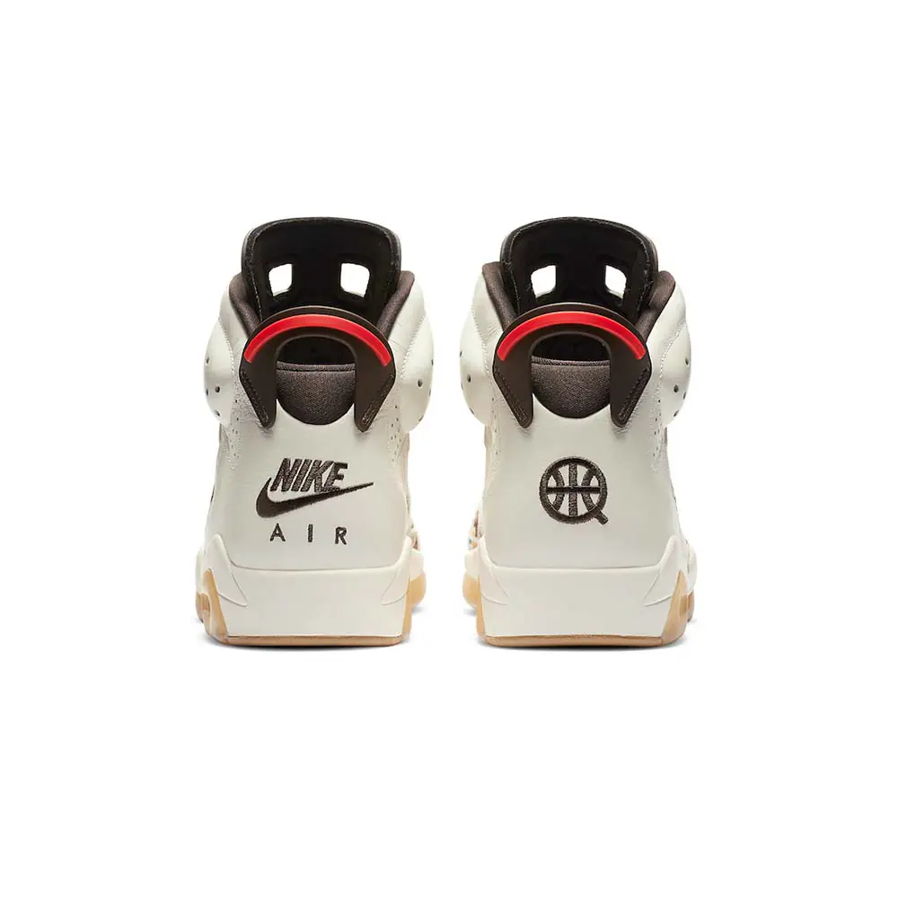The Air Jordan 6 “Quai 54” is one of two colorways released by Jordan Brand in 2020 that coincides with the annual streetball tournament in Paris, France. Both colorways of Michael Jordan’s beloved sixth signature shoe display a Sail leather base with patterned textile underlaid panels on either side. This version features an orange and maroon multidirectional motif within the aforementioned design found on the mid-panel. Brown embroidered Jumpman branding can be found on the cream colored nylon overlay on the tongue. The red lace toggle features a white Jumpman logo and co-branded “Nike Air” and “Quai 54” embroidery graces the left and right heel, respectively. Release date: August 8, 2020.