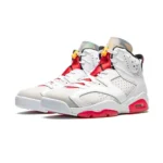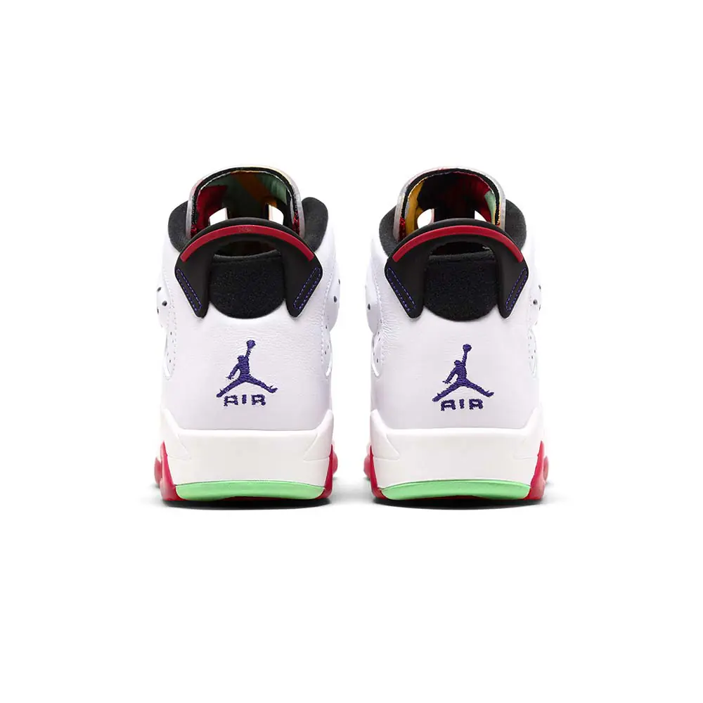 The Air Jordan 6 “Hare” is a Spring 2020 release that features overtures to another classic Jordan shoe: the original Air Jordan 7 “Hare.” Famously appearing on the feet of Bugs Bunny during the early ’90s television commercials with Michael Jordan, the “Hare” Jordan theme returns with a modern twist as Jordan Brand honors the legacy of “The GOAT’s” sneaker collection. White leather overlays contrast the light grey perforated synthetic nubuck base that appears on the mid-panel and toe. A red neoprene lace cover with a black Jumpman logo sits just below the clear rubber tongue that reveals the multicolor geometric pattern found on the Jordan 7’s tongue underneath. An orange and green lace-lock that resembles a carrot adds the final special touch for the upper, while red translucent rubber highlights the sole.