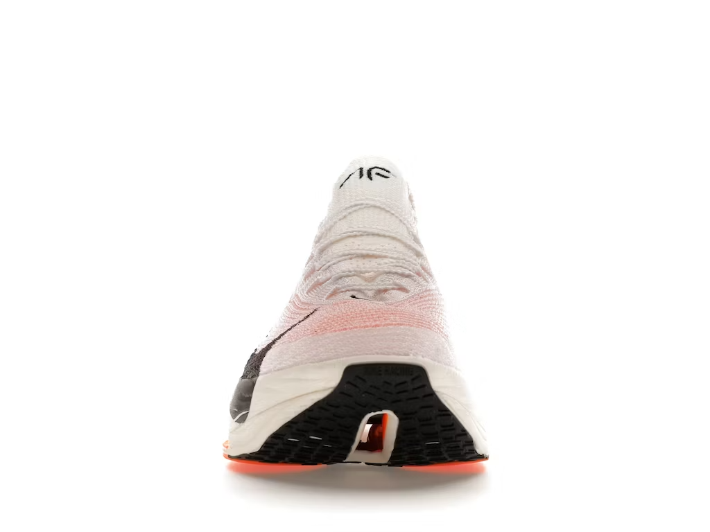 The Prototype colorway of the Air Zoom Alphafly NEXT% 3 features an upper constructed from white to pale orange gradient Atomknit. The “V62” on the medial side collar indicates that this is the 62nd version of this lightweight fabric, while the number of the midsole refers to a Nike test runner that put the most miles on this shoe. To complete the look of this upper, an oversized black Nike swoosh is printed across the quarter panel and extends onto the midsole.