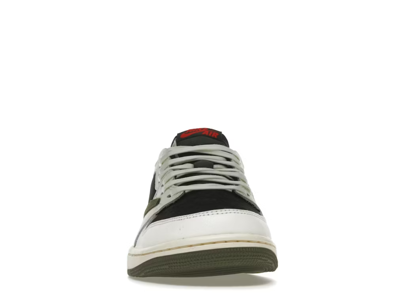The Air Jordan 1 Low OG SP Travis Scott Olive is constructed with white leather and black nubuck uppers. Travis continued to use his signautre reverse style Nike Swoosh, in an olive green colorway. The limited edition sneakers have an aged midsole that sits on top of an olive green outsole.