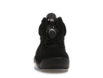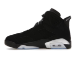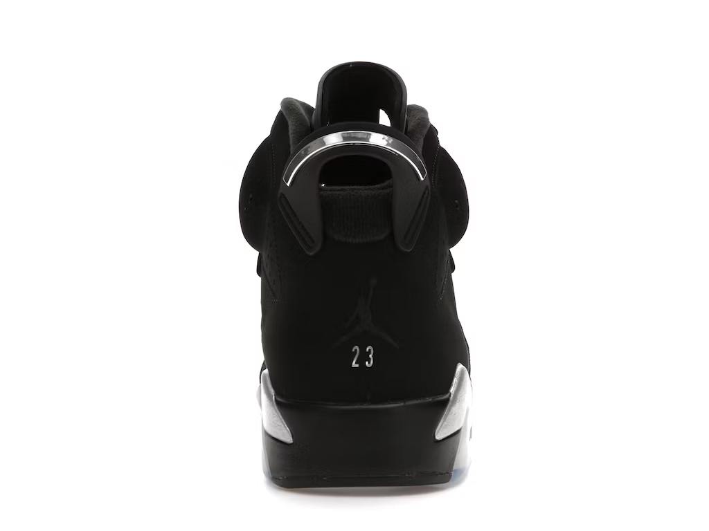 This Retro Air Jordan 6 comes in a black/metallic silver-chrome colorway. The sneaker has a mid-top mounted on a black polyurethane midsole, highlighted with metallic silver accents and supported by a translucent rubber outsole. The shoe has a branding of silver Jumpman on the lace guard. It also has a windowed tongue, lace locks, and a spoiler-like heel tag.