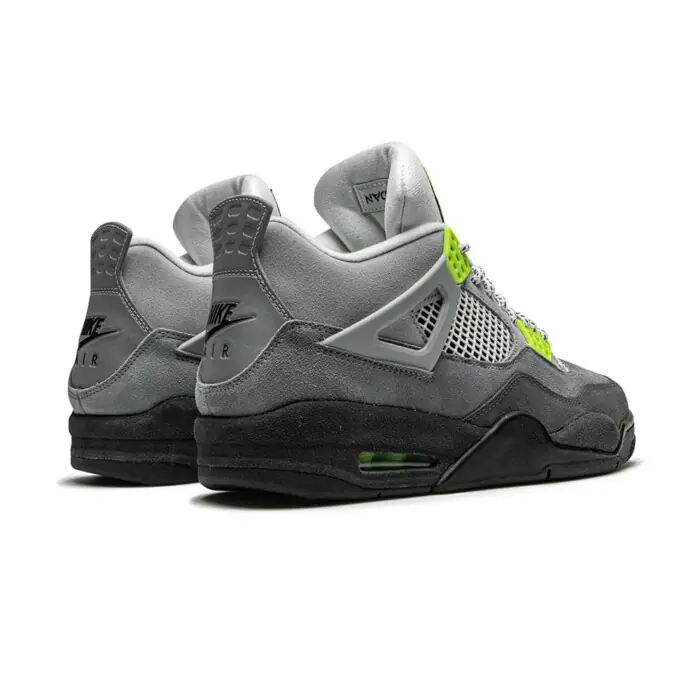 The Air Jordan 4 “Air Max 95 Neon” is a special Air Max month release of Michael Jordan’s fourth signature basketball sneaker that honors the equally legendary Air Max 95 “Neon” colorway. The Air Max 95 “Neon” debuted in 1995 as the flagship design of the highly innovative performance running sneaker that instantly became popular thanks to its appealing looks, top flight comfort, and first-ever visible forefoot Air. Now, the ahead-of-its-time design finds its way to the Air Jordan 4 and the results are favorable. Donning the upper is the same gradient grey color scheme of the Air Max 95 that features various shades of the neutral color starting from light at the collar and gradually getting darker as it works down to the midsole. Bright neon accenting along the netted panel, eyelets, and Jumpman branding on the tongue and heel add ’90s-era contrasting to the silhouette. Finishing off the look is a black rubber midsole with a visible neon-tinted Air unit in the heel.