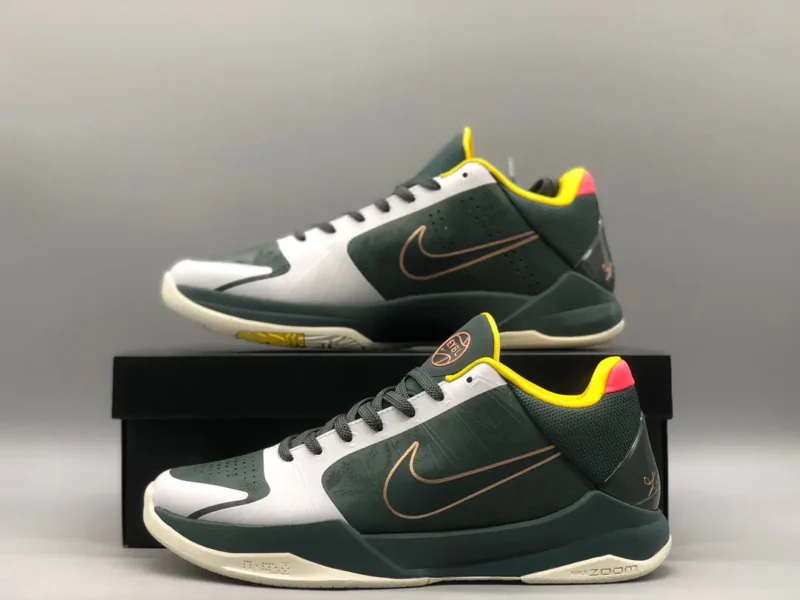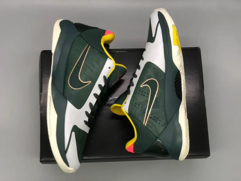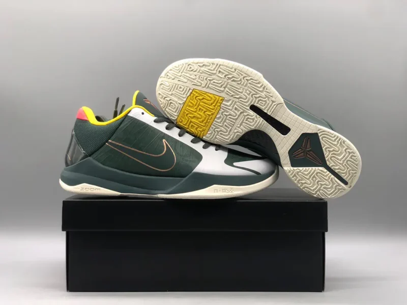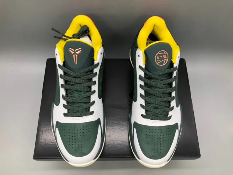 Kobe 5 Protro EYBL Girls (2020)Brings back a beloved colorway initially released in 2010 as part of the Nike Basketball Christmas Day Collection. Updated with contemporary Zoom Air cushioning technology, the sneaker features the eye-catching aesthetic of the original, highlighted by a vibrant green finish on the upper. Polyurethane ‘islands’ cover the synthetic upper, mimicking the texture of snakeskin while also providing added durability.