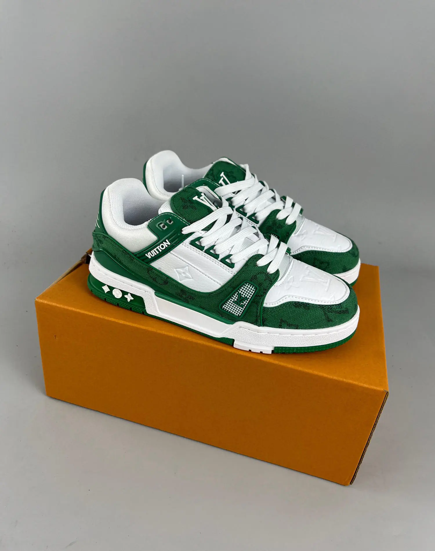 LOUIS VUITTON Green & White Monogram Canvas ‘LV Trainer’ Sneakers