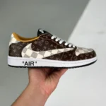 Virgil Abloh never failed to impress the crowd as he collaborated with Gucci and Jordan Brand. Travis Scott x Air Jordan 1 Low x Lv sneakers showcase high-ankle pair with the classic Travis Scott x Air Jordan 1 Low x Lv leather bases. It is also accented with brown perforated toe and mid-panel with black overlays. The sneakers include light brown Nike Swooshes on the side. Additionally, these shoes also reveal a Lv pattern print on the shoe. These Lv sneakers are completed with brown rubber outsoles.