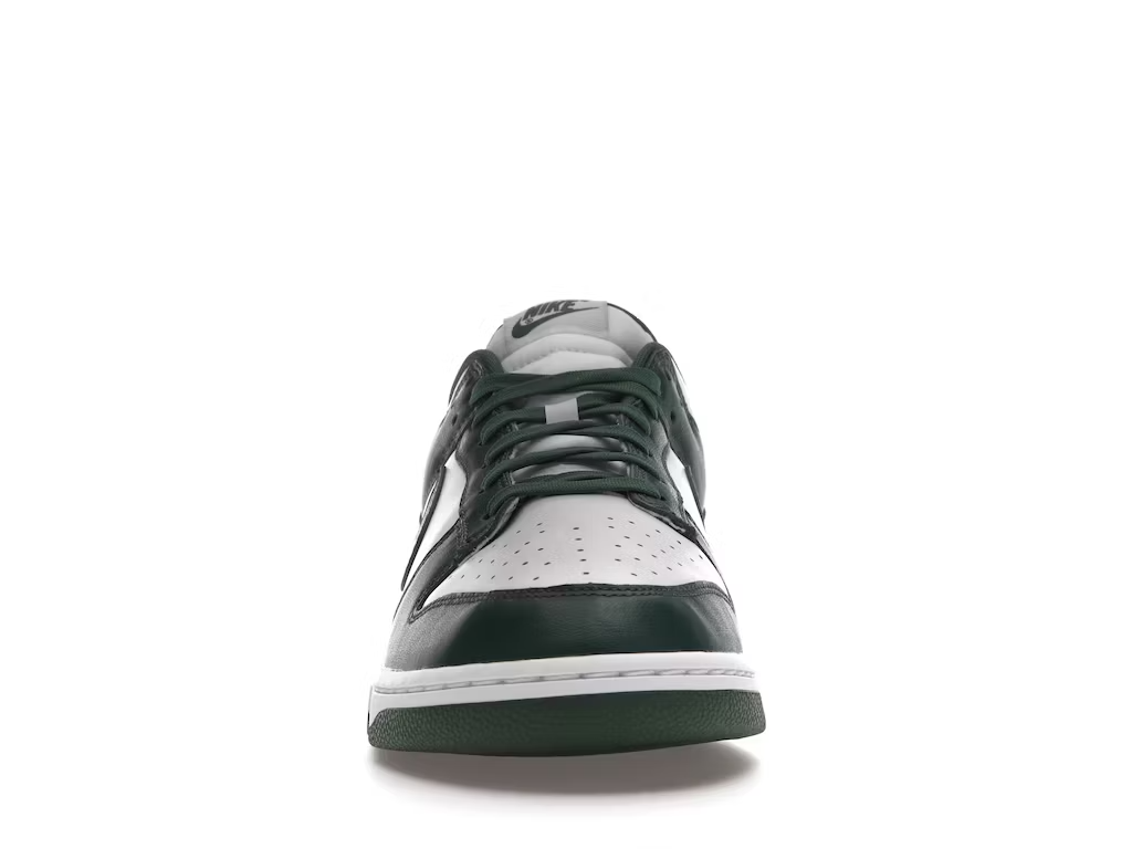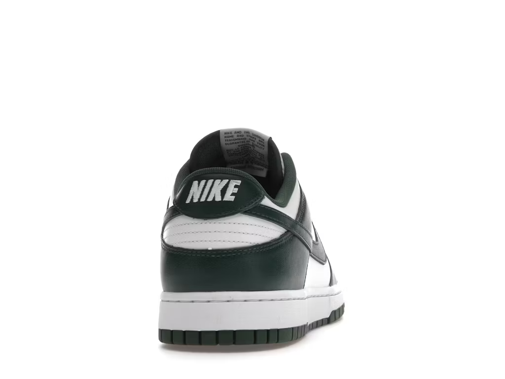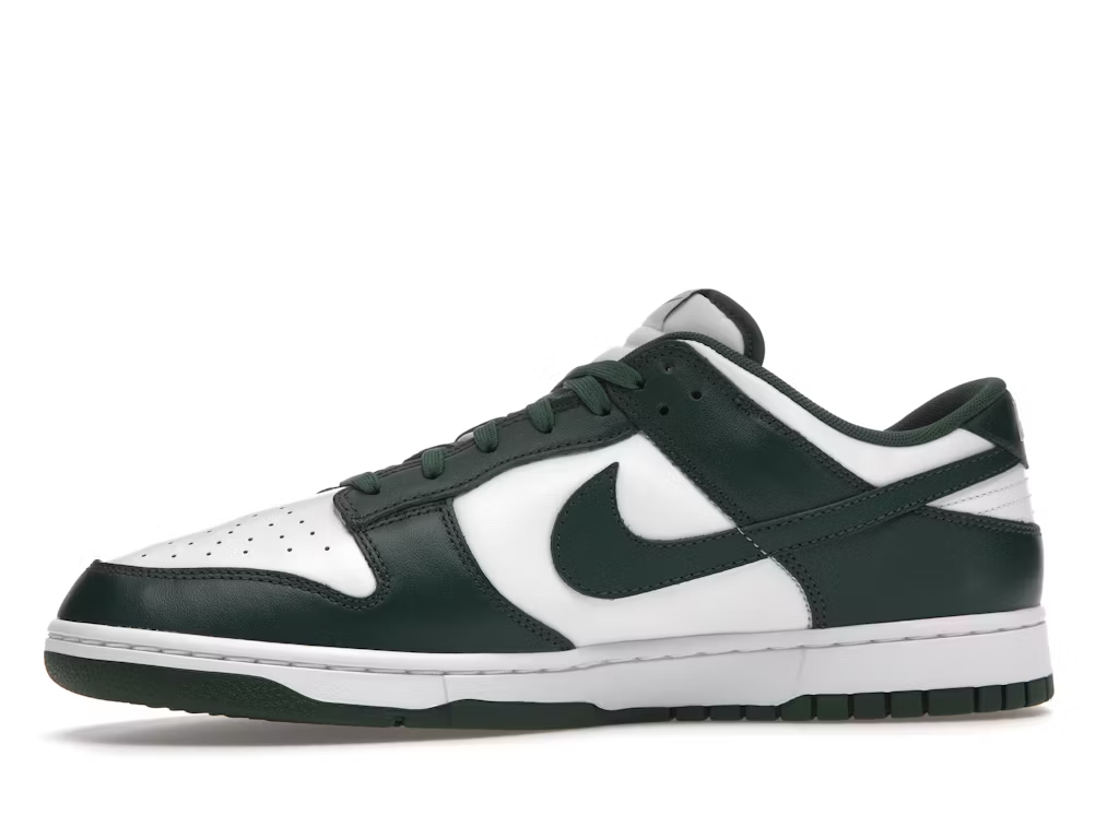 The Nike Dunk Low Varsity Green is composed of white leather uppers with Varsity Green leather overlays and Swoosh logos. From there, woven retro Nike logo tongue labels and heel embroidery nod to original Dunks from 1985.