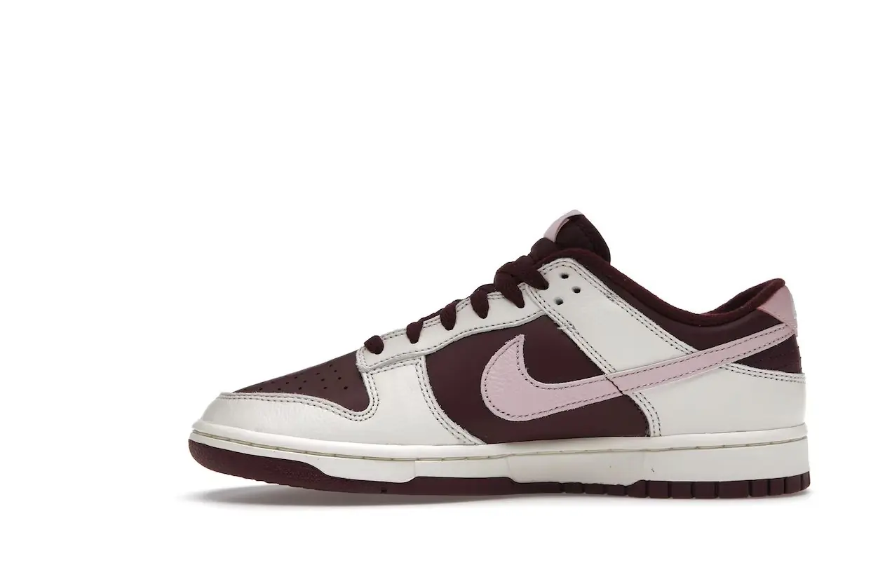 The Nike Valentine’s Day Dunk Low has a burgundy and sail leather upper with a tumbled pink leather Swoosh. The limited edition sneakers have burgundy outsoles, a mesh sockliner, and is tied off with burgundy shoe laces.