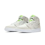 Dressed in a Vast Grey, Ghost Green, and White color scheme. This mid-top Air Jordan 1 features a mix of premium materials including mesh, suede, smooth leather and faux croc all done in its Grey hue. 3M reflective detailing covers the woodgrain-like finish on the side panels and toe, while having a vibrant Green tongue completed with velcro tongue tags. Black detailing, a Swoosh lace dubrae atop a White rubber sole completes the design.