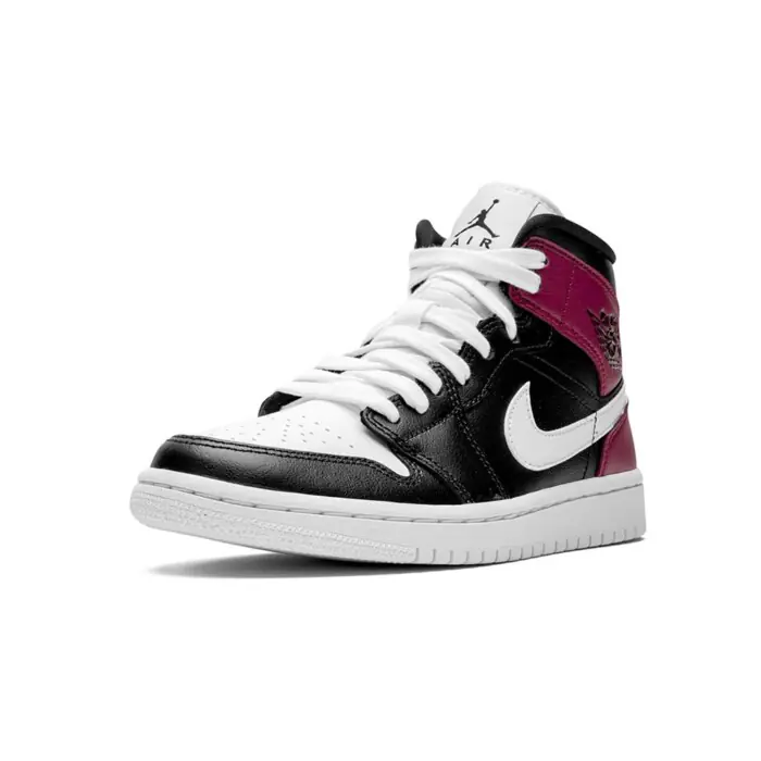 This offering of the mid-top Air Jordan 1 features White leather on the toe and Swoosh with Black leather overlays on the toe, side panels and upper collar. Noble Red is used around the heel completed with a solid White rubber sole.