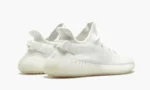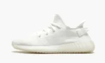 done in white so it is camouflaged within the upper. A cream midsole wraps around Boost cushioning to create a pristine version of the silhouette. The Yeezy Boost 350 V2 “Triple White” first released in 2017, and made a comeback in